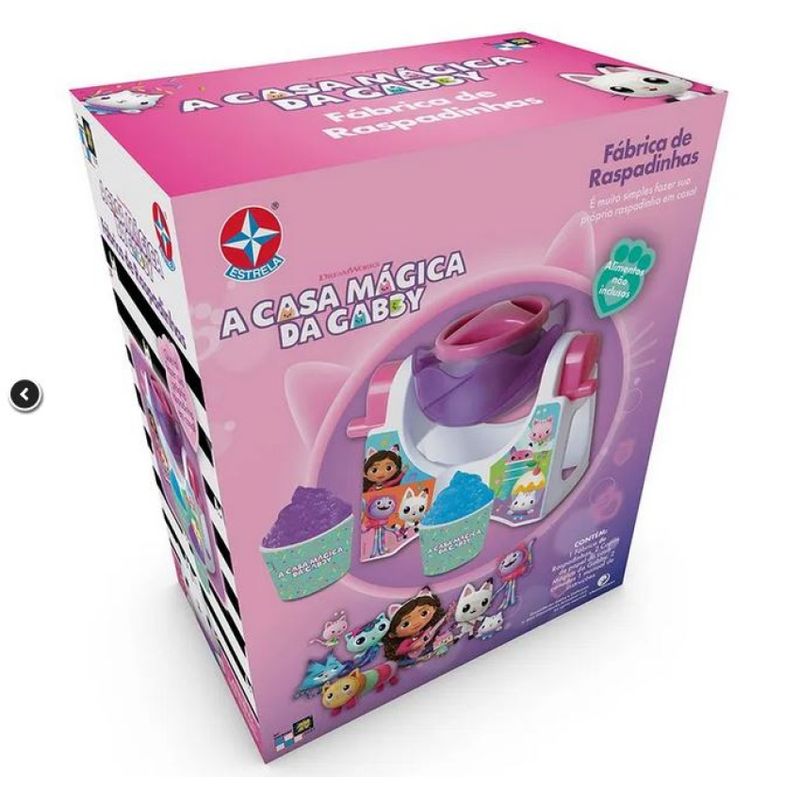 Itens Inclusos: 1 Fábrica de Raspadinha, 1 Manual de instruções, 2 copos de papel com a temática A Casa Mágica da Gabby, 2 canudos, 1 espátula.