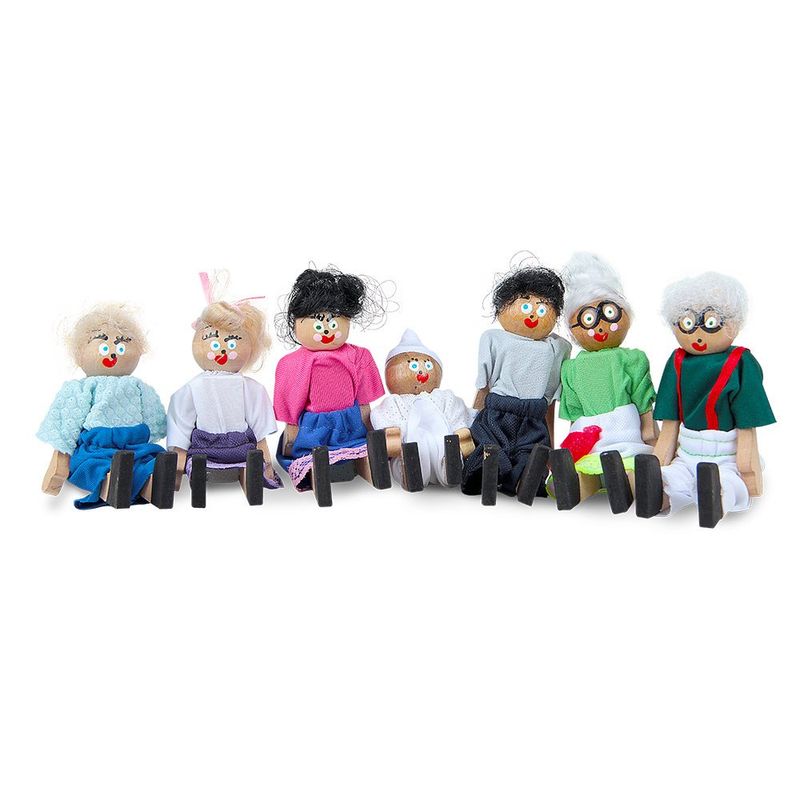 Os bonequinhos articulados de madeira possibilitam atividades lúdicas aliadas a momentos de interação adulto/crianças. Possibilita a interação com diversos tipos de profissões, bem como a importância de todas elas.Bonecos de madeira e tecido, articulados, personalizados conforme característica e pintados com tinta atóxica, composto por 7 personagens: Vovô, Vovó, Papai, Mamãe, Bebê, Menina e Menino. Embalagem: Caixa de M.D.F. com tampa serigrafada, medindo 30 x 16 x 5 cm. Lacrada com película de P.V.C. encolhível.