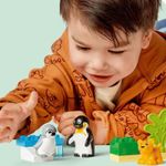 "Conjunto DUPLO para crianças a partir de 2 anos, que traz 4 figuras de animais (pinguim adulto, pinguim filhote, leão adulto e leão filhote) e pequenas construções representando seus habitats. Permite brincar com escorregador de gelo para os pinguins e pastagem para os leões, estimulando o jogo imaginativo, a empatia e a coordenação motora.\n\nIdade recomendada:8-13 anos;Composição/Material:Plástico;Funciona com pilhas:Não;Brinquedo com luz:Não;Brinquedo com som:Não;Dimensões:18,7x14x6 cm;Peso:0,162 kg;Código de Barras:5702017783833;Garantia do Fornecedor:3 Meses contra defeito de fabricação;"