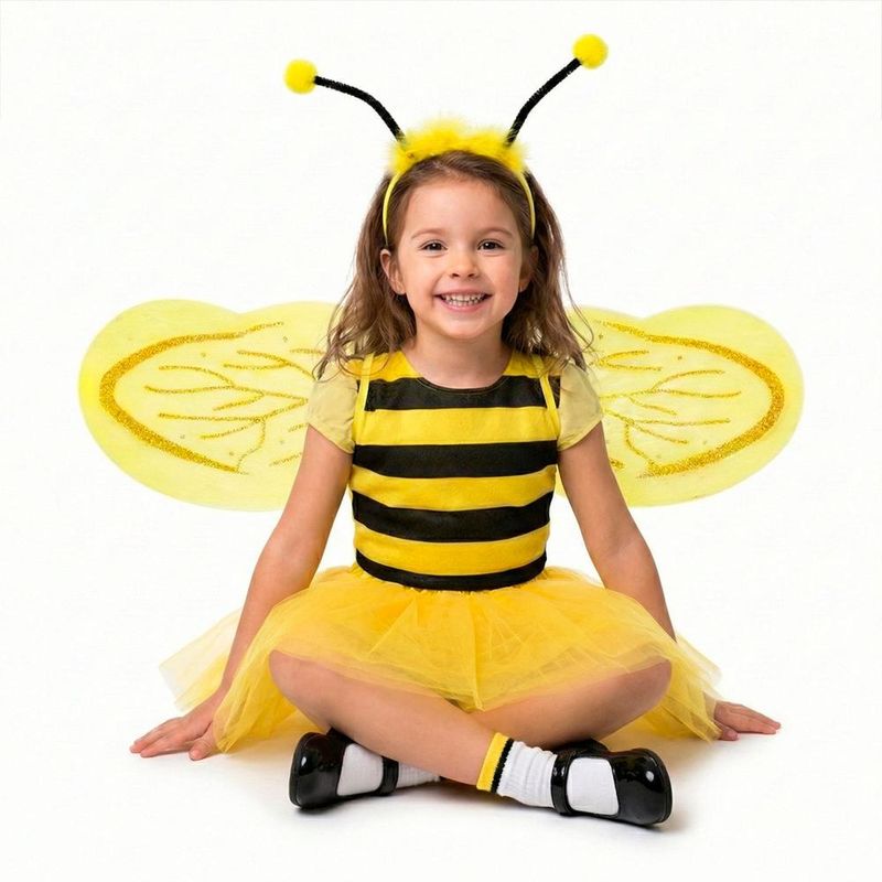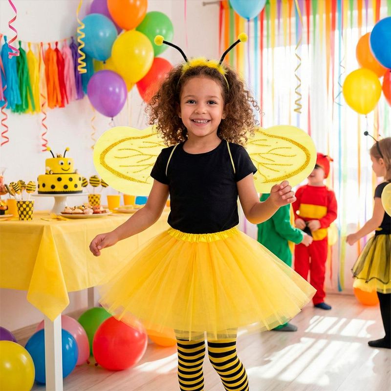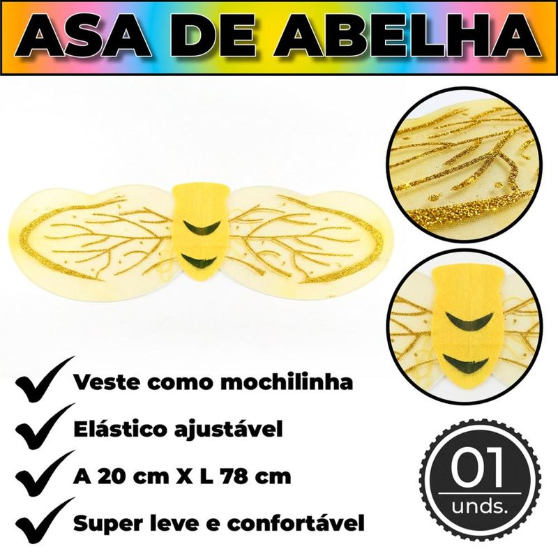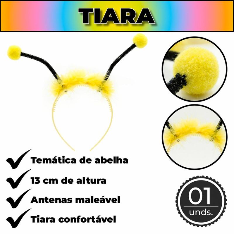 Deixe sua pequena zumbir de alegria com este encantador Kit Fantasia de Abelhinha Infantil! Um conjunto completo de 3 peças que transforma qualquer brincadeira em um momento mágico, perfeito para Carnaval, festas de aniversário temáticas, apresentações escolares e dia da fantasia. O kit destaca-se pelos detalhes brilhantes e cores vibrantes. A Asa de Abelha é grande (78 cm de largura), feita de material levemente transparente com veios desenhados em glitter dourado, e veste confortavelmente como uma mochila graças aos elásticos ajustáveis. A Saia de Tule amarela possui uma cor viva, cintura elástica com acabamento acetinado e 28 cm de comprimento, ideal para crianças. Para finalizar, a Tiara traz anteninhas maleáveis com pompons amarelos e uma base peluciada super fofa.Kit Completo 3 Peças Asa deslumbrante com detalhes em glitter dourado Saia confortável com tule amarelo com 28 cm de comprimento Tiara temática com antenas maleáveis, pompons e acabamento fofo Todo o conjunto é super leve e confortável para não atrapalhar a diversão