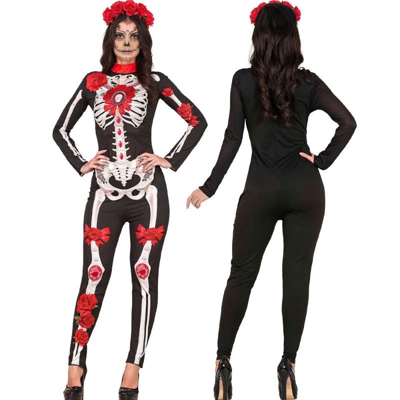 Esta fantasia é uma peça única, um macacão que modela super bem o corpo, criando uma silhueta esguia e sofisticada. A parte frontal é coberta por uma rica estampa de esqueleto, lindamente decorada com desenhos de flores e rosas vermelhas, enquanto a parte de trás é toda preta. Com um prático zíper traseiro, é uma fantasia fácil de vestir e perfeita para aproveitar a noite toda.