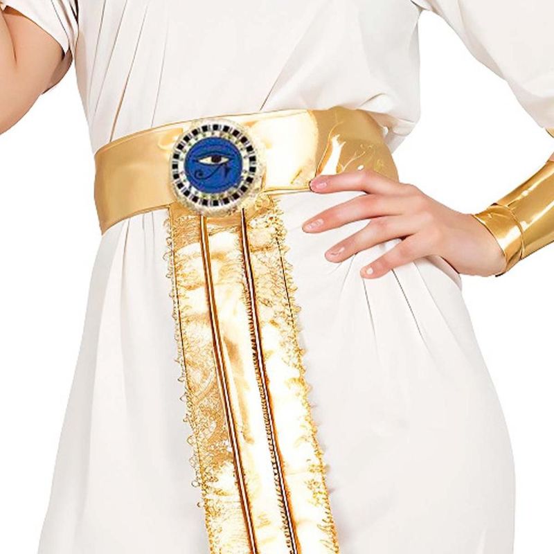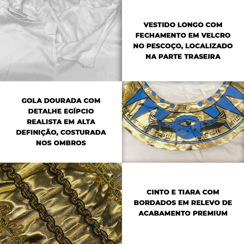 Sinta-se como a rainha do Egito com a Fantasia Cleópatra Adulta. Este conjunto é a escolha perfeita para quem quer um visual elegante e majestoso no Halloween, festas temáticas ou eventos de cosplay. O vestido é longo e branco, com um cinto e um colarinho de material dourado com detalhes em tecido azul, que dão o toque de realeza ao traje. O vestido é leve e confortável, proporcionando liberdade de movimento para que você possa aproveitar a noite como a rainha que você é! Uma fantasia que une beleza, história e conforto para uma celebração inesquecível.Vestido branco longo e elegante Colarinho e cinto dourados e azuis Ideal para festas temáticas, Halloween e cosplay Visual luxuoso e majestoso OBS: Não acompanha Cobra, Braceletes e sandálias.