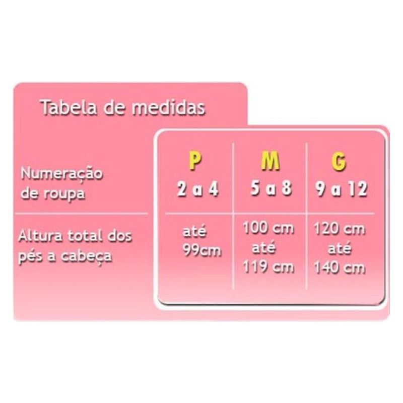 P - Numeração de roupa 2 a 4 Crianças Com até 99cm de altura total dos pés a cabeça.