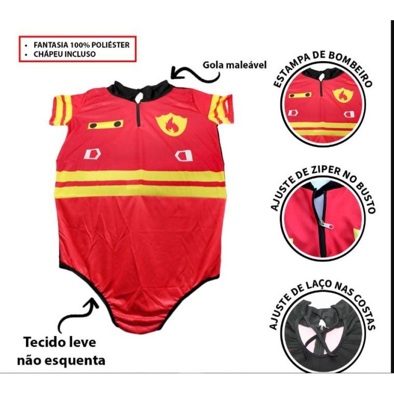 Esta fantasia de bombeira é confeccionada em poliéster, apresenta um body com gola maleável, é feita de tecido leve que não esquenta, possui uma estampa de bombeiro autêntica, ajuste de zíper no busto, laço ajustável nas costas, saia com elástico na cintura e suspensórios, e acompanha um charmoso chapéu. É uma escolha perfeita para festas temáticas, oferecendo conforto, estilo e autenticidade à sua transformação em uma bombeira corajosa.