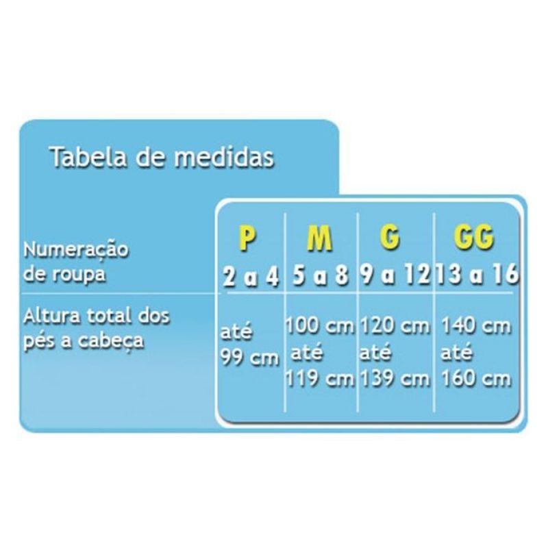 GG - Numeração de roupa 13 a 16, para crianças que tenham de 140 a 160 cm de altura, dos pés a cabeça.