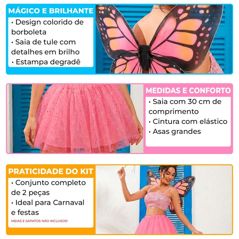Liberte sua magia e prepare-se para voar na pista de dança com este Kit Fantasia de Borboleta Adulta! A combinação perfeita de praticidade e charme para quem quer um look de destaque no Carnaval, festas à fantasia, despedidas de solteira ou festivais. O kit é composto por uma asa vibrante e colorida, feita em material levemente transparente com uma armação estruturada que a mantém sempre aberta e imponente. Ela é fácil de vestir graças às alças elásticas que se ajustam aos ombros como uma mochila. Para completar o visual festivo, a saia de tule rosa traz um toque de brilho com acabamento em glitter. Pensada para o corpo adulto, ela possui três camadas de tecido para garantir volume bonito e maior cobertura, além de um elástico confortável na cintura que se adapta a diferentes medidas.Kit Real 2 Peças Design colorido e realista com estrutura firme que não deforma Tule rosa com detalhes em glitter Cintura com elástico confortável Ideal para compor looks de fada, borboleta ou seres mágicos em bloquinhos e festas