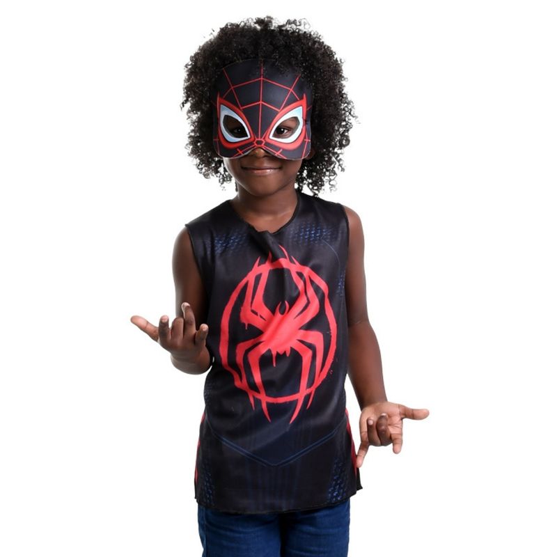 Fantasia do personagem Miles Morales de Spider Man Across The Spider Verse, da Marvel, versão pop, camiseta regata em tecido 100% poliéster, acompanha máscara em espuma anti chamas, disponível nos tamanhos P, M e G.