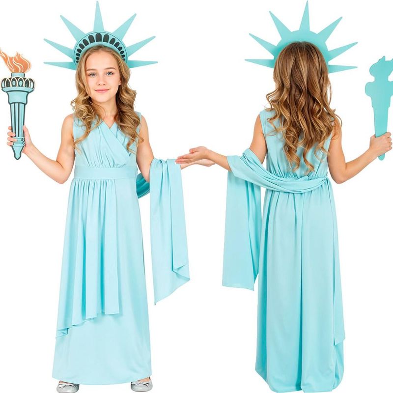 Design fiel à Estátua da Liberdade, ideal para eventos históricos e apresentações. Vestido fluido e drapeado, proporcionando um visual elegante e sofisticado. Acompanha coroa de EVA azul-claro, com raios estilizados. Tocha icônica incluída, trazendo autenticidade ao traje. Ideal para apresentações escolares, festas temáticas e desfiles cívicos.