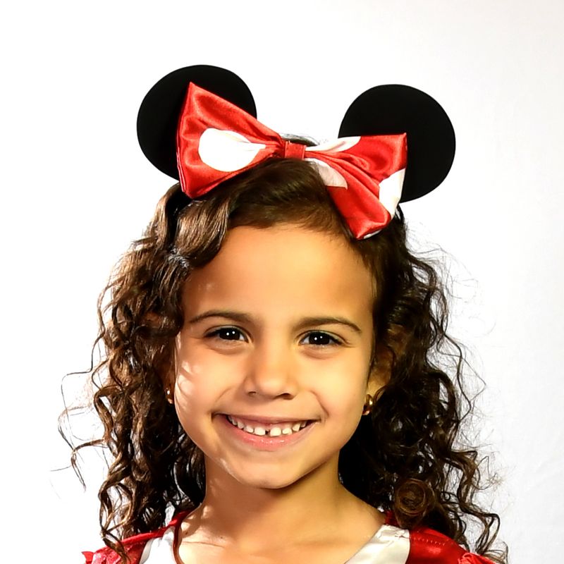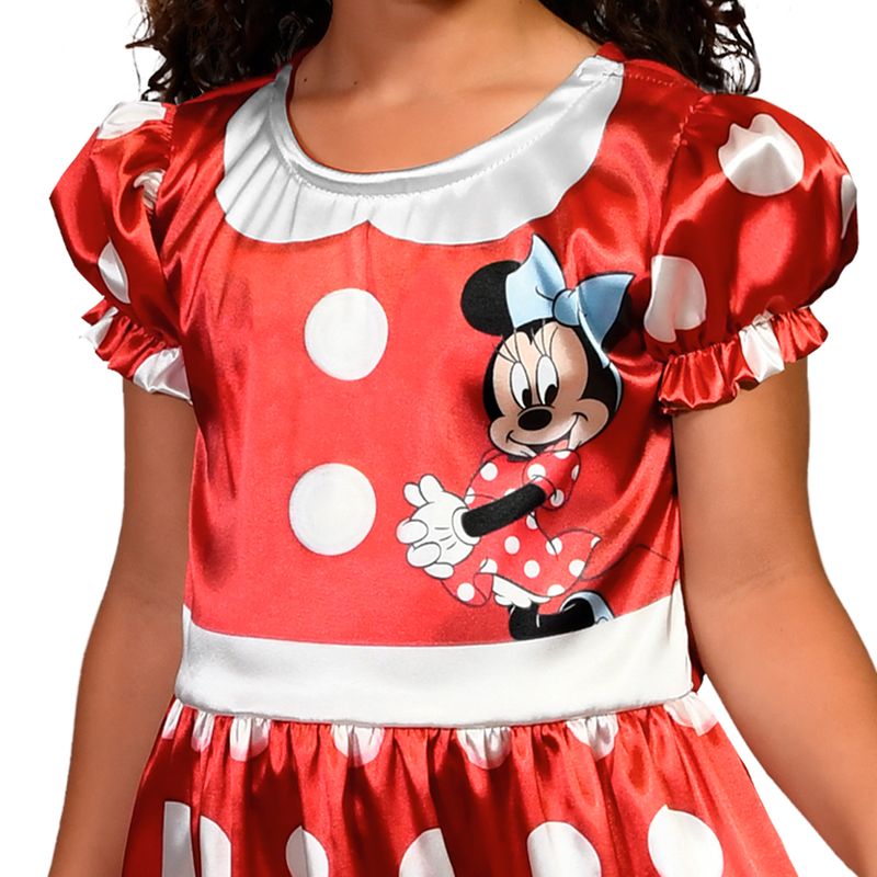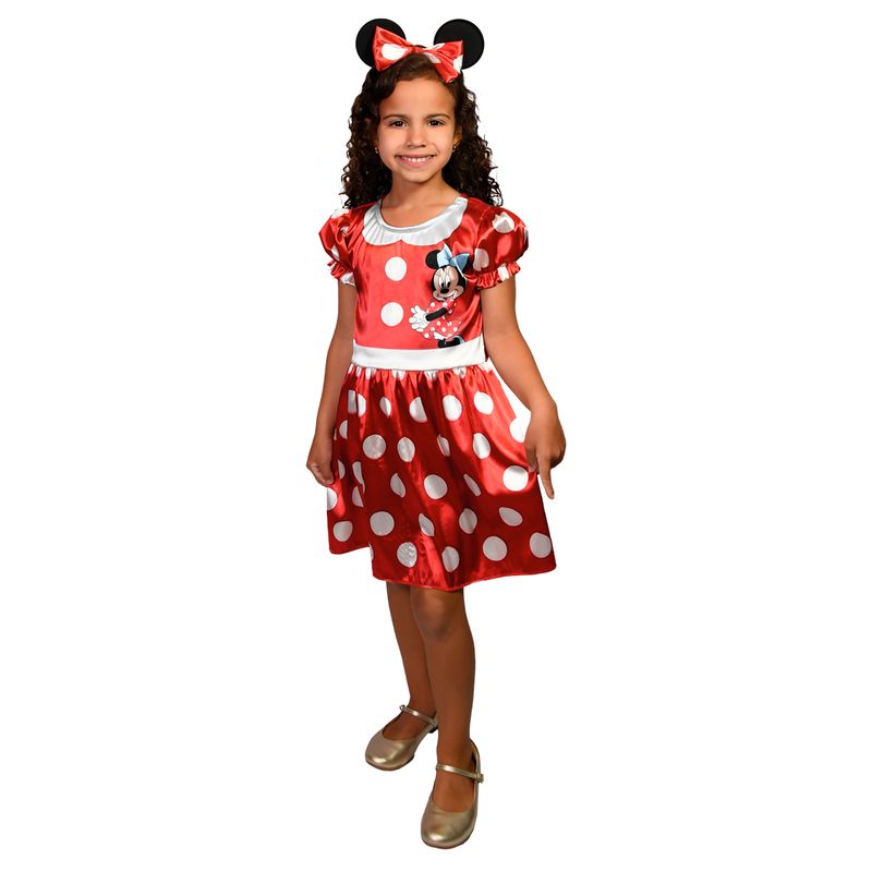 Transforme sua pequena em uma verdadeira estrela com a adorável fantasia da Minnie, a personagem mais amada da Disney. Este vestido curto com mangas curtas é confeccionado em tecido 100% poliéster e decorado com artes estampadas que capturam todo o charme da Minnie. Para completar o look, a fantasia acompanha uma tiara com as icônicas orelhinhas e laço da Minnie.