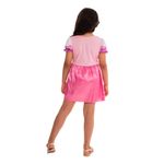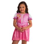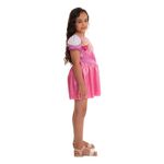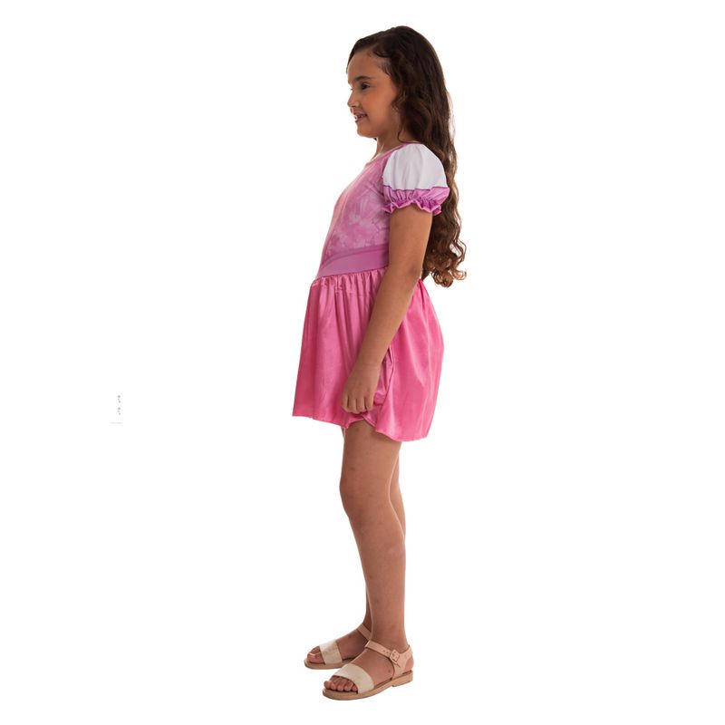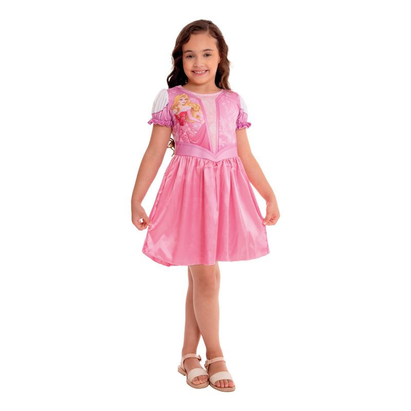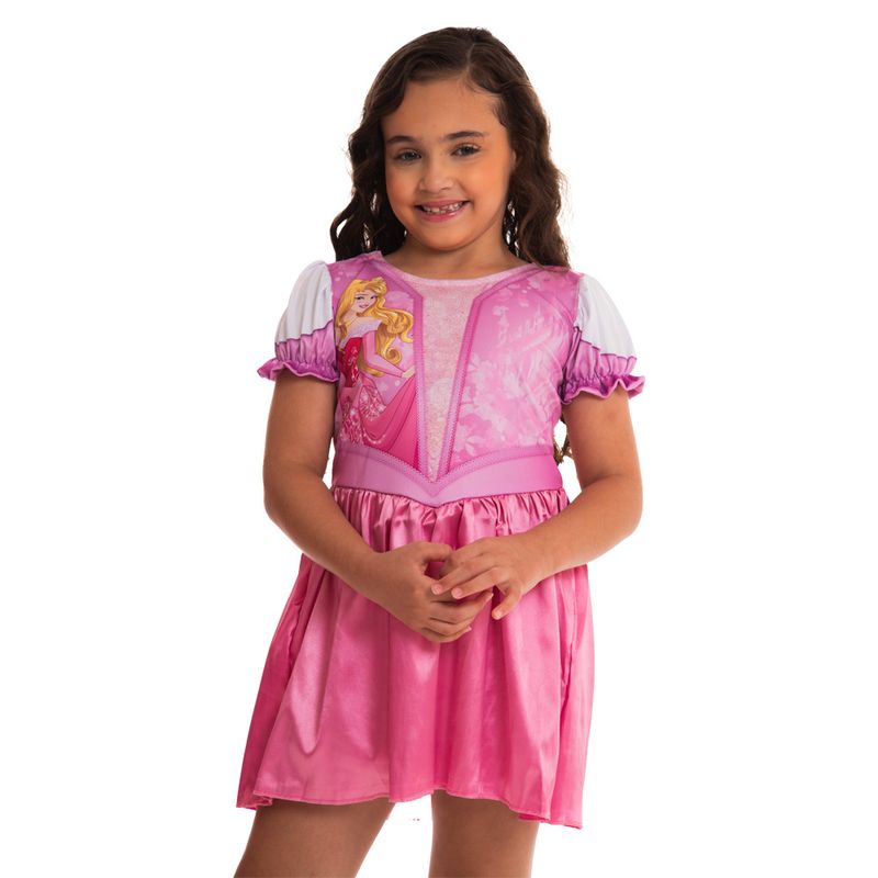 Transforme sua pequena em uma verdadeira princesa com a fantasia da Aurora, uma das icônicas Princesas Disney. Este vestido curto com mangas curtas, feito em tecido 100% poliéster, exibe artes estampadas que capturam toda a magia e o encanto da personagem.