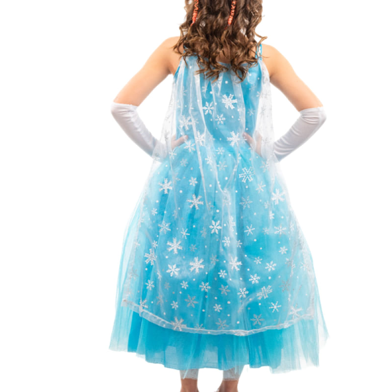 A saia volumosa de tule proporciona um efeito deslumbrante, dando à sua pequena a sensação de estar flutuando em um reino de neve e estrelas. A capa de organza com estrelas prateadas adiciona um toque celestial, criando um visual digno das histórias mais encantadoras.