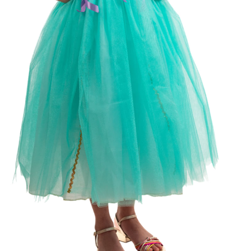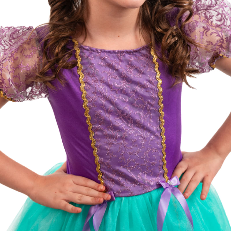 Nossa Fantasia Longa de Princesa em Roxo e Verde é uma promessa de um mundo encantado para sua pequena princesa. O corpo superior feito de helanca proporciona conforto e elasticidade, enquanto o detalhe de tule ombro a ombro e a aplicação de organza glitada com galão dourado no centro do corpo adicionam um toque de elegância.