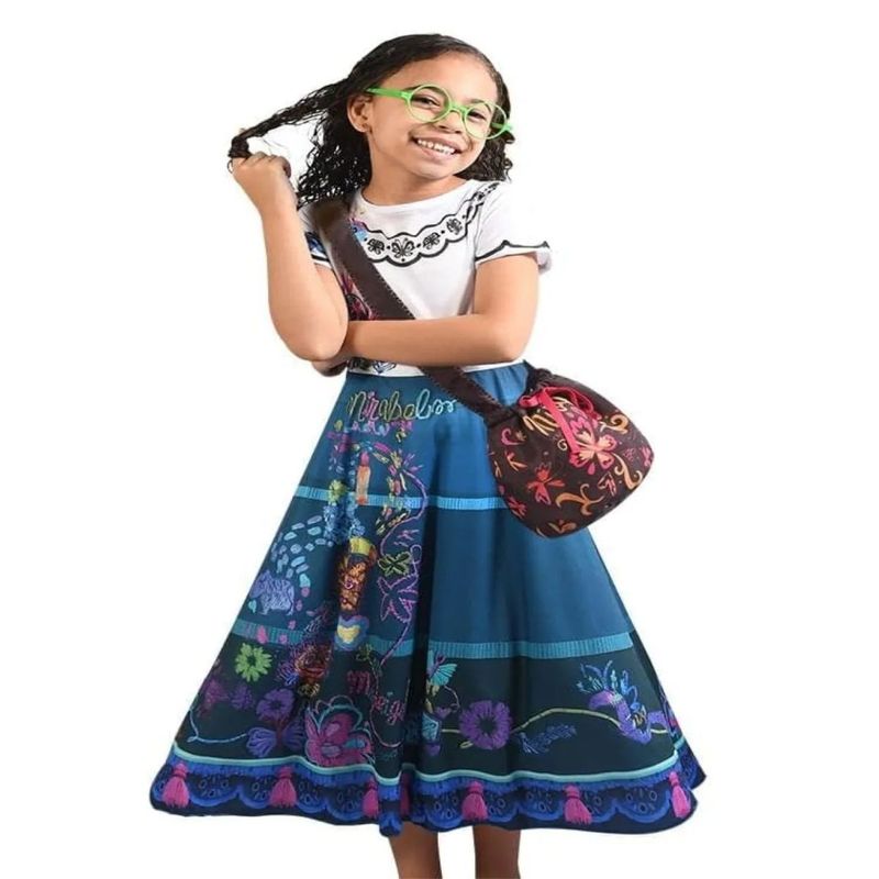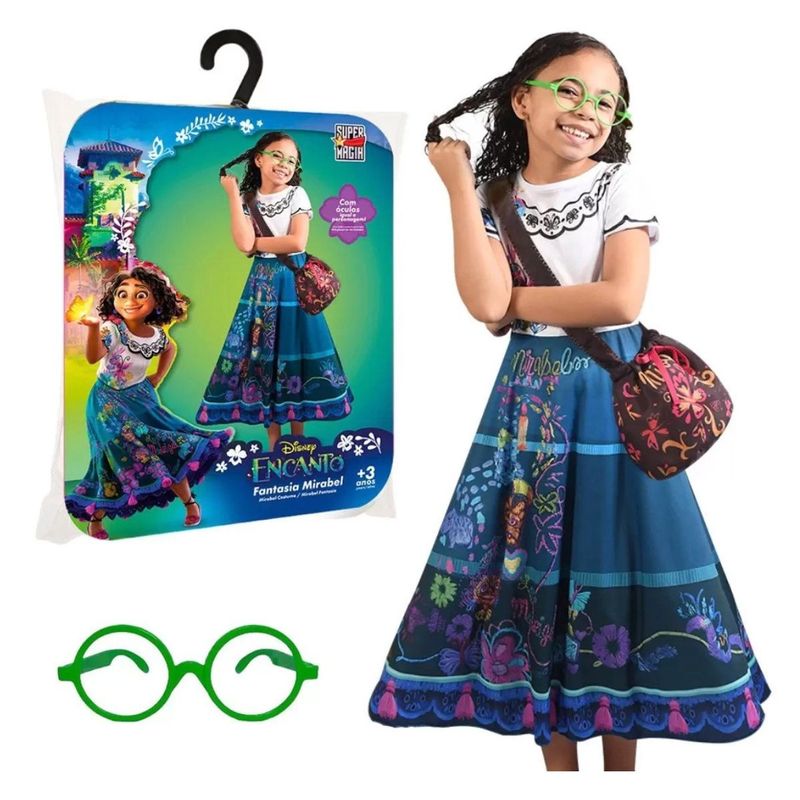 Fantasia da personagem Mirabel do filme Disney Encanto, vestido longo, mangas curtas, em tecido 100% poliéster, acompanham bolsa e óculos igual a personagem.