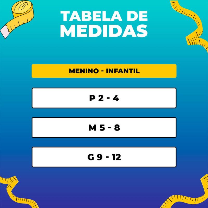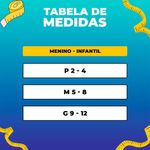 Tamanho P - Veste Numeração de roupa 2 a 4 anos M - Veste Numeração de roupa 5 a 8 anos G - Veste Numeração de roupa 9 a 12 anos Ficou na dúvida de qual tamanho escolher ? Sempre indicamos a escolha de um tamanho maior pois é mais fácil fazer um ajuste, caso necessário.