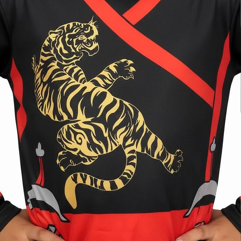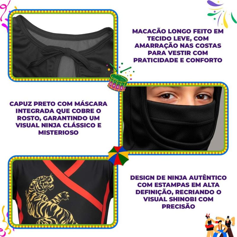 Roupa de Ninja Preto Longo com Capuz e Máscara Fantasia Carnaval e Halloween Menino Infantil Desperte o guerreiro interior do seu filho com esta incrível Fantasia Ninja Preto Infantil! Este traje completo é ideal para festas de aniversário, Carnaval ou para estimular a imaginação em brincadeiras heróicas. O macacão longo é confeccionado em tecido leve e respirável, garantindo total liberdade de movimento para as manobras mais ousadas. O design autêntico apresenta estampas de alta definição que recriam o visual Shinobi com precisão, incluindo detalhes de um tigre dourado. O capuz com máscara integrada completa o visual misterioso, transformando o pequeno em um verdadeiro mestre das artes marciais com total conforto e praticidade.Macacão longo em tecido leve e confortável Estampa em alta definição com tema Shinobi Capuz com máscara integrada que cobre o rosto Sistema de amarração nas costas para facilitar o uso Material resistente ideal para festas e eventos Design clássico e visual heróico garantido OBS: NÃO ACOMPANHA SAPATOS.