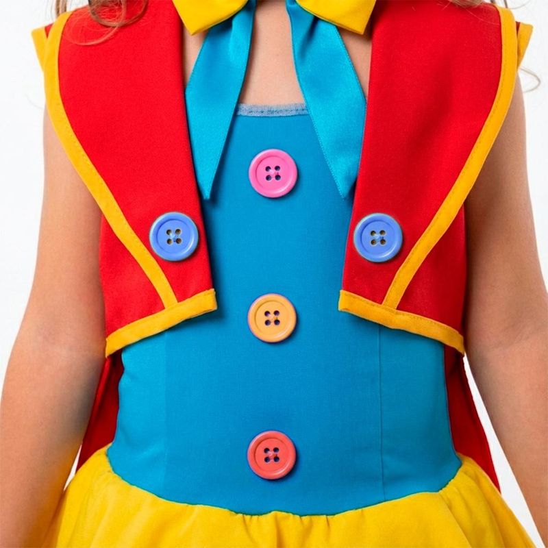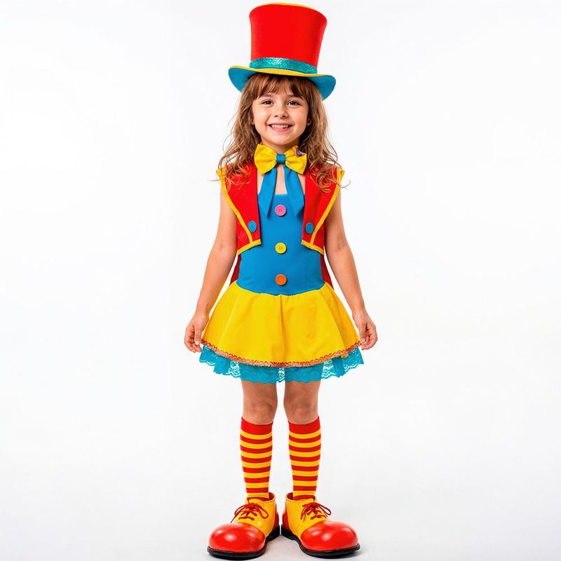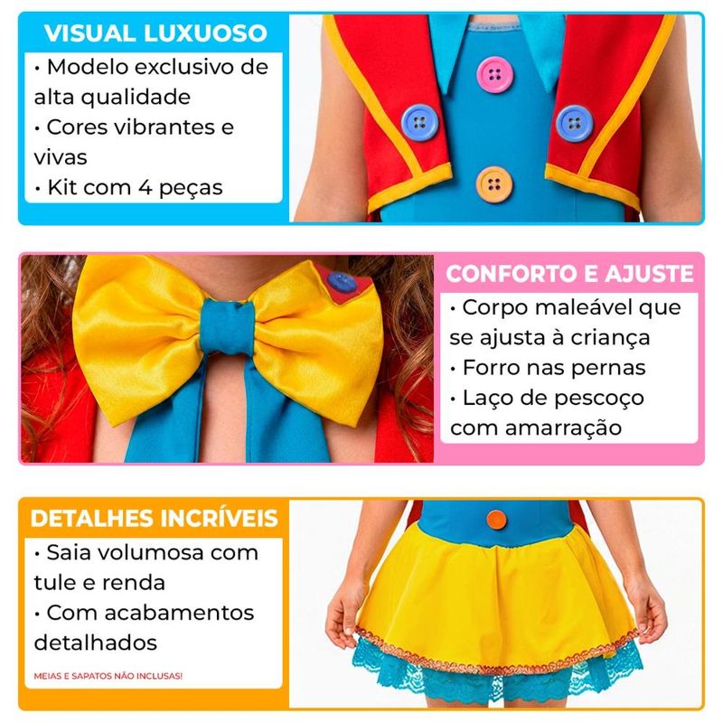 O espetáculo vai começar! Transforme sua pequena na estrela do picadeiro com a Fantasia Infantil de Palhacinha Luxo. Este modelo exclusivo é perfeito para festas com tema de circo, aniversários e apresentações escolares, trazendo cores vibrantes e um acabamento impecável que encanta a todos. O kit é composto por 4 peças essenciais que criam um visual completo e sofisticado. O vestido possui um corpo maleável que se ajusta confortavelmente à criança e uma saia com camada de tule e renda, garantindo um lindo volume sem pesar. Pensando no bem-estar, a fantasia conta com forro nas pernas para não pinicar. O look se completa com um colete charmoso, um laço borboleta de amarrar e uma cartola grande e firme que dá o toque final de magia.Kit Completo Conforto Garantido Possui forro interno nas pernas Design de Luxo Saia volumosa com tule, acabamento em renda Ajuste Perfeito Laço de pescoço com amarração Atenção: Meias e sapatos não estão inclusos.