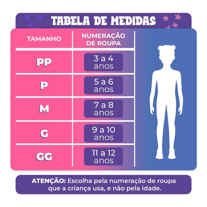 Tamanho PP - Veste Numeração de roupa 3 á 4 anos.P - Veste Numeração de roupa 5 á 6 anos.M - Veste Numeração de roupa 7 á 8 anos.G - Veste Numeração de roupa 9 á 10 anos.GG - Veste Numeração de roupa 11 á 12 anos. Ficou na dúvida de qual tamanho escolher ?Sempre indicamos a escolha de um tamanho maior pois é mais fácil fazer um ajuste, caso necessário. E por ser para criança, a fantasia irá durar por mais tempo conforme ela for crescendo.