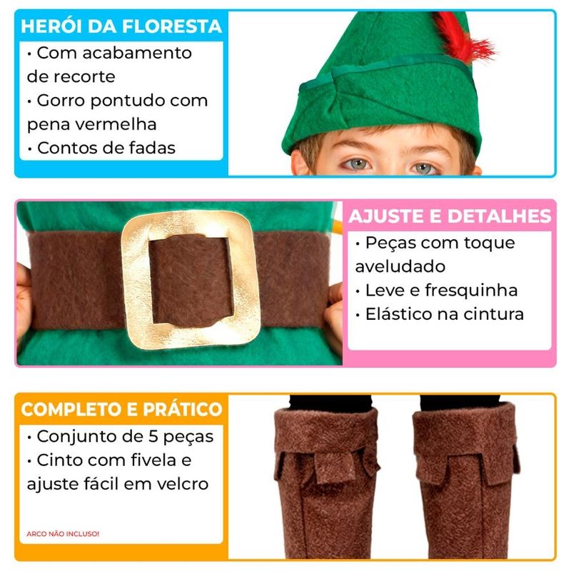 Prepare seu pequeno herói para defender o reino com a nossa Fantasia de Robin Hood Infantil. Também conhecida como Ladrão do Bosque ou Arqueiro Medieval, esta fantasia é ideal para festas escolares, Carnaval, aniversários temáticos e peças de teatro. O diferencial deste produto está na qualidade dos materiais: a camisa, o chapéu, o cinto e as sobrebotas são confeccionados com um tecido de toque aveludado, proporcionando um visual de luxo e maior conforto ao toque. A calça preta é feita de poliéster leve com elástico na cintura, garantindo que a criança não sinta calor excessivo e tenha liberdade de movimentos. O cinto possui ajuste em velcro, facilitando o vestir. O kit acompanha 5 peças, incluindo o icônico chapéu com pena e as sobrebotas que transformam qualquer calçado em botas medievais. Garanta já a fantasia do príncipe dos ladrões e deixe a imaginação fluir!Kit Completo Conforto Premium Toque aveludado Ajuste Fácil Visual Temático Atenção: Arco e Flechas não incluso!