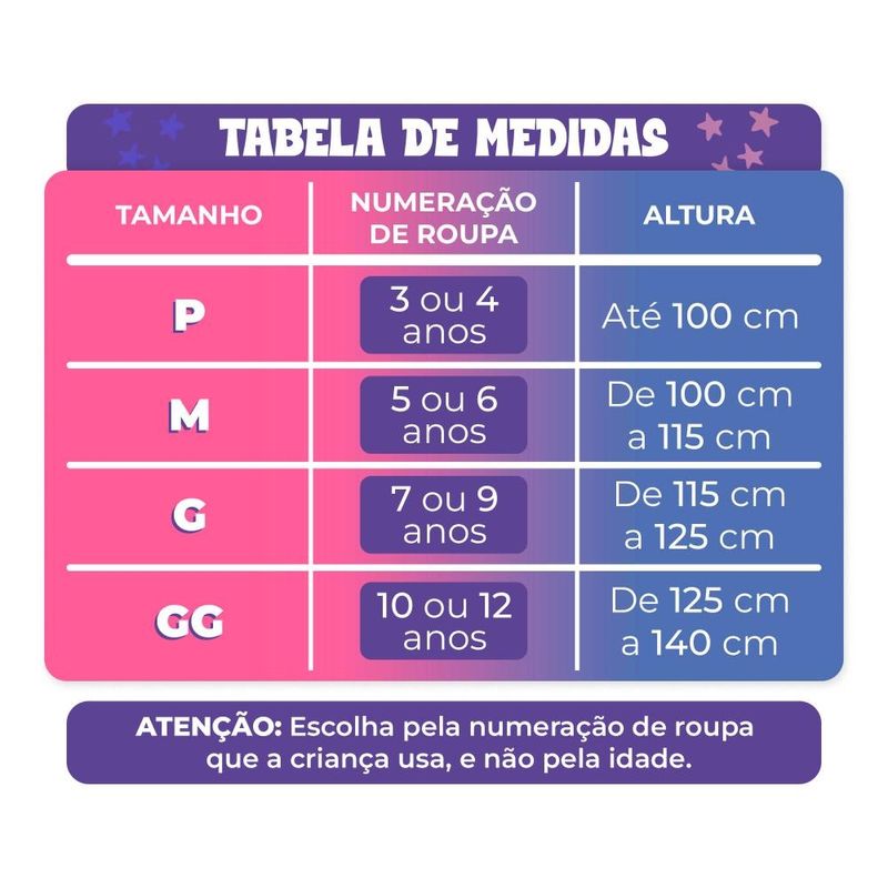 Tamanho P - Veste Numeração de roupa tamanho 3 - 4 anos M - Veste Numeração de roupa tamanho 5 - 6 anos G - Veste Numeração de roupa tamanho 7 - 9 anos GG - Veste Numeração de roupa tamanho 10 - 12 anos Ficou na dúvida de qual tamanho escolher ? Sempre indicamos a escolha de um tamanho maior pois é mais fácil fazer um ajuste, caso necessário. E por ser para criança, a fantasia irá durar por mais tempo conforme ela for crescendo.
