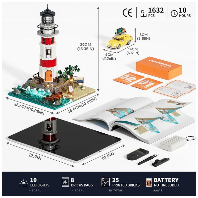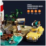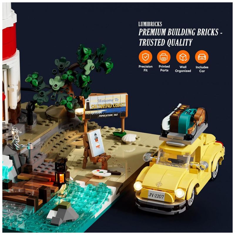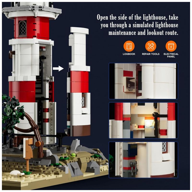 O kit acompanha três minifiguras temáticas e um automóvel em estilo clássico que pode ser estacionado na área de acesso ao farol. Os detalhes de construção incluem peças impressas com mapas, sinalização de segurança e elementos de acabamento em rochas e mar.??