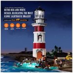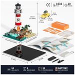 Conjunto de blocos de montar com 1632 peças que representa um farol costeiro em estilo clássico, com torre cilíndrica em faixas vermelhas e brancas sobre base rochosa com praia e mar em relevo. A composição inclui base com textura de costa, ondas espumadas, área de areia e elementos de paisagem para montagem de dioramas de litoral.??