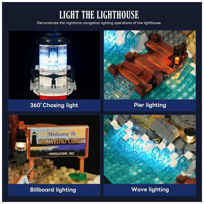 O conjunto utiliza sistema de iluminação com 10 pontos de LED e 6 tiras de luz, incluindo iluminação sob as ondas para efeito de brilho na água, postes na área frontal e luz interna na torre. No topo, o farol utiliza módulo circular de LEDs acionados em sequência para simular rotação de 360° do facho de luz.??