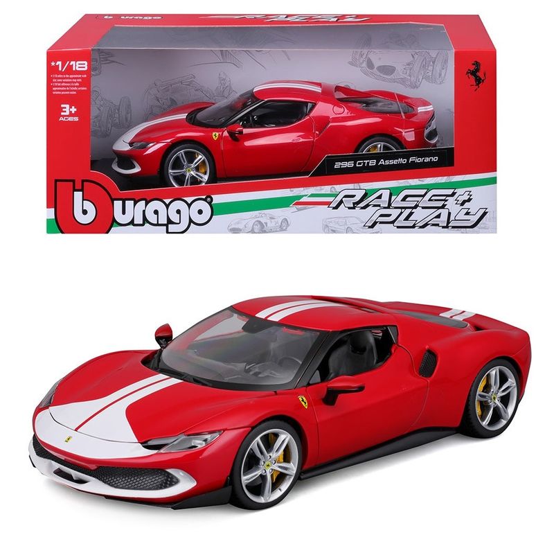 Ferrari 296 GTB Assetto FioranoMarca do produto: Bburago.Escala: 1/18 (aproximadamente 25 cm de comprimento).Pneus de Borracha.Abre portas, capô e porta malas .Rodas esterçam (volante acompanha movimento das rodas).Acompanha base expositora.Miniatura em Metal com partes de plástico.