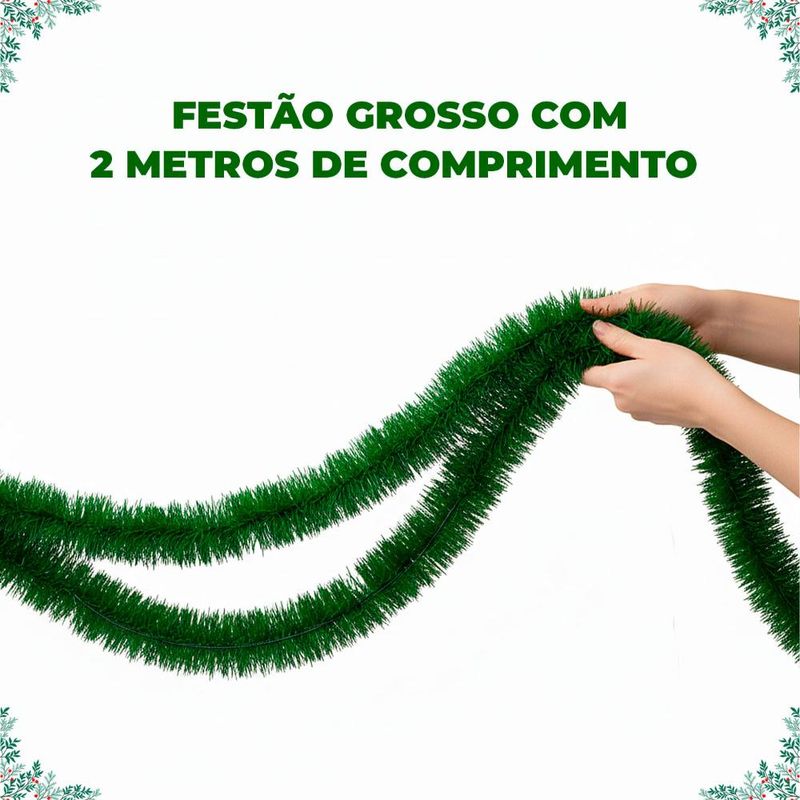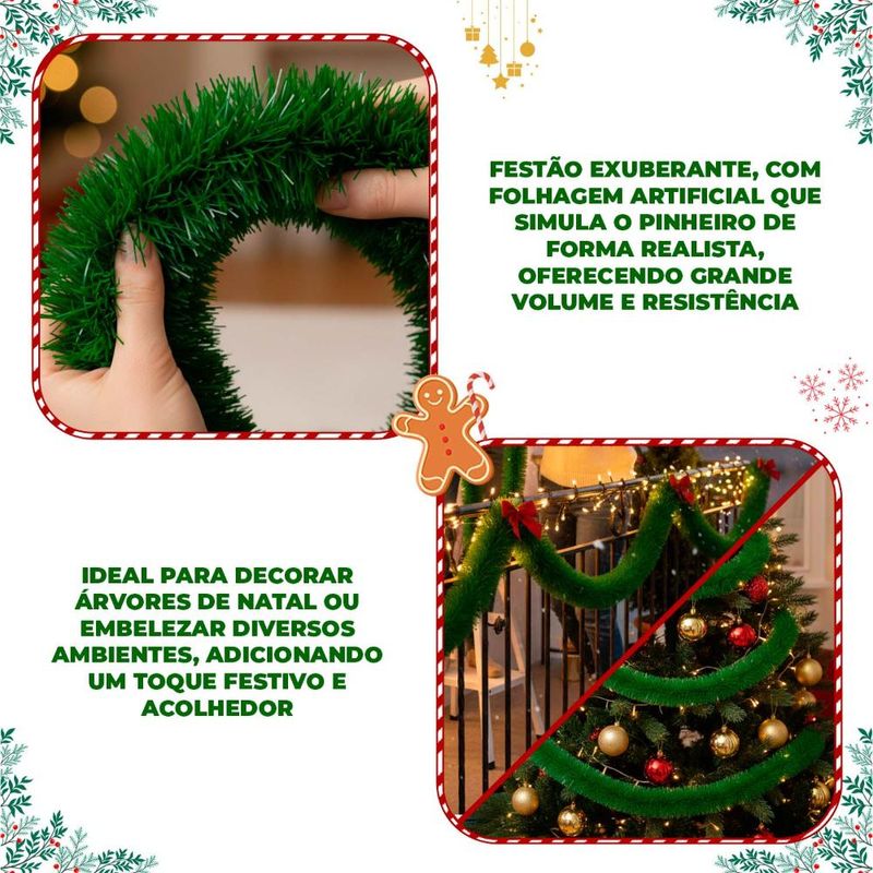 Transforme sua decoração natalina com este Kit de 5 com Festões Grossos, ideais para criar um visual exuberante e acolhedor em qualquer ambiente. Cada festão possui 2 metros de comprimento e folhagem artificial que simula o pinheiro verde natal de forma realista, oferecendo grande volume e resistência. Com um total de 10 metros de extensão, o kit é perfeito para encher árvores de Natal, embelezar escadas, portais ou janelas. Além disso, o material é à prova d’água, permitindo o uso seguro tanto em ambientes internos quanto externos, como varandas e jardins. Os festões são fáceis de manusear e podem ser combinados com luzes pisca-pisca e outros enfeites, garantindo um toque festivo e memorável em sua casa. Kit com 5 Festões Grossos 10 Metros de Festao 2 Metros de comprimento cada Folhagem artificial com volume e resistência Cor Verde Natural Ideal para áreas internas e externas Material à prova d’água (Pode Molhar) OBS: Este kit contém 5 unidades de Festão com 2 metros cada.