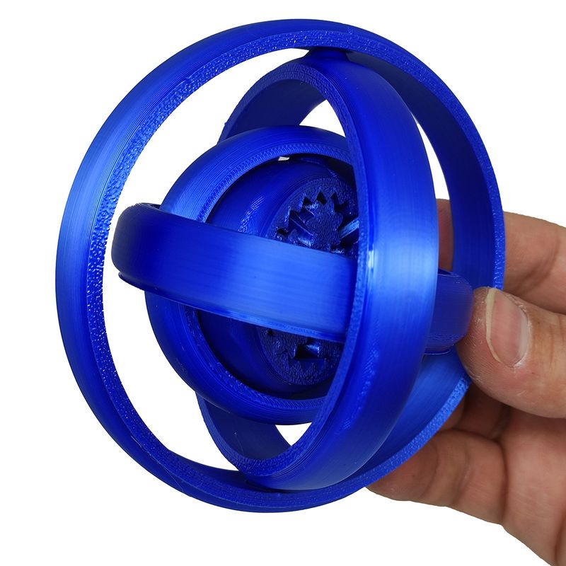 O Fidget Giroscópio Engrenagens Spinner Anti Estresse é um brinquedo relaxante com design giratório em formato de giroscópio, impresso em 3D e com acabamento azul metálico.