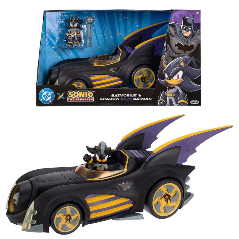 Um portal se abre e Shadow surge em Gotham com o veículo perfeito para sua missão. Este Batmóvel especial possui um lançador frontal que dispara projéteis e uma traseira rotativa. A figura com traje do vigilante noturno comanda esta máquina em preto, roxo e amarelo. Cada disparo e giro transforma qualquer espaço em campo de batalha de uma viagem multiversal. Quando Shadow ativa os mecanismos de combate, realidades inteiras ficam mais seguras.