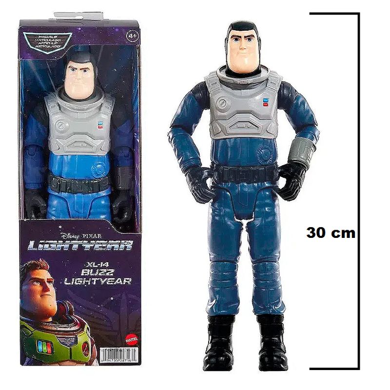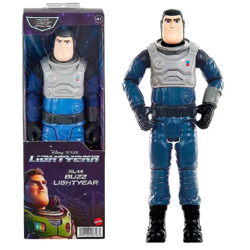 A figura de ação Buzz Lightyear XL-14 é um boneco grande e articulado, projetado para recriar as aventuras do filme Lightyear da Disney e Pixar. Especificações Principais: Modelo: Buzz Lightyear XL-14. Fabricante: Mattel. Número do Modelo/Item: SKU HJJ26 (HHK07número da linha de produtos). Altura: Aproximadamente 28 cm a 30,5 cm (11 a 12 polegadas). Articulação: Possui entre 12 a 14 pontos de articulação móveis, permitindo uma variedade de poses dinâmicas. Material: Principalmente plástico resistente. Acessórios: Geralmente inclui acessórios específicos do filme, como um capacete removível e, em algumas versões, uma pistola de sinalização (flare gun) que se encaixa na mão ou no quadril do boneco. Idade Recomendada: Para crianças a partir de 4 anos de idade. Características Adicionais: A figura é detalhada e inspirada diretamente no visual do filme, mas não possui recursos eletrônicos como luzes ou sons nesta versão específica. Esta figura é ideal tanto para fãs jovens que desejam reviver as cenas do filme quanto para colecionadores, devido ao seu design autêntico e capacidade de pose.