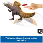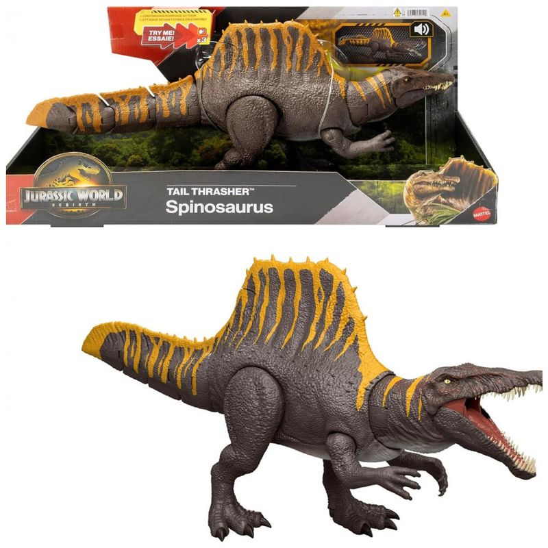 Figura de ação Spinosaurus Tail Thrasher da linha Jurassic World Rebirth, com escultura baseada no filme, incluindo vela dorsal volumosa, cauda segmentada e proporções detalhadas para colecionadores e crianças a partir de 4 anos. A estrutura em plástico articulado permite posicionar o dinossauro em diferentes posturas de batalha e exibição, com juntas móveis em pontos estratégicos.?