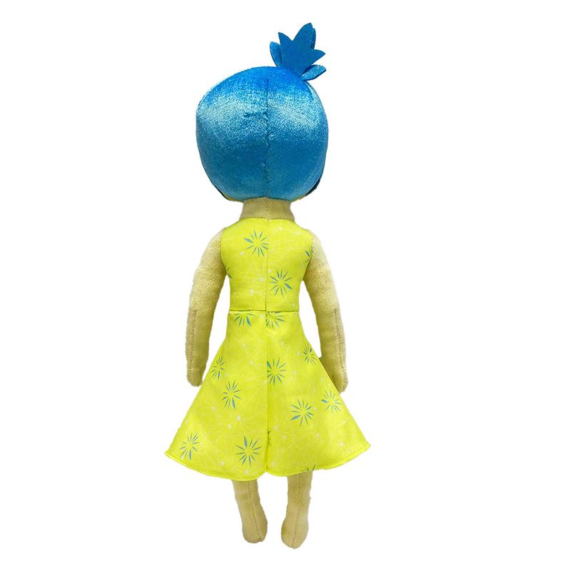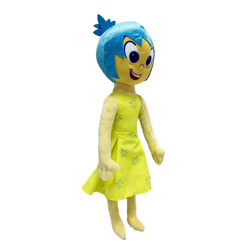 A Pelucia da Alegria possui e tem cabelos azuis e um vestido amarelo e sua tem tons de amarelo, refletindo sua natureza luminosa e contagiante. A face da pelúcia vem com um sorriso contagiante, refletindo a disposição feliz e otimista da personagem.