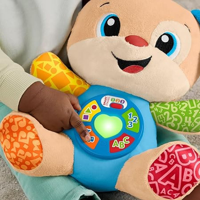 O Fisher Price Cachorrinho Aprende Comigo é um brinquedo musical de pelúcia que apresenta ao bebê suas primeiras palavras de forma divertida e interativa. Com luzes e mais de oitenta músicas, sons e frases, ele traz diferentes ativações pelo toque, incluindo um botão em forma de globo que permite selecionar entre quatro idiomas e um coração que acende enquanto ensina cores, tornando a brincadeira ainda mais envolvente.