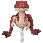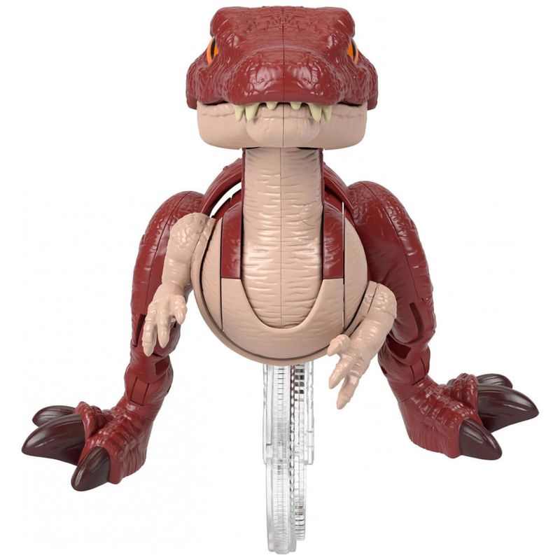 A figura possui gatilho na cauda que, ao ser pressionado, aciona um movimento de investida em que o dinossauro avança, movimenta braços e pernas e abre a mandíbula em ação de “mordida”. A crista dorsal utiliza material com textura “real feel”, oferecendo estímulo tátil adicional durante o manuseio.?
