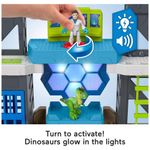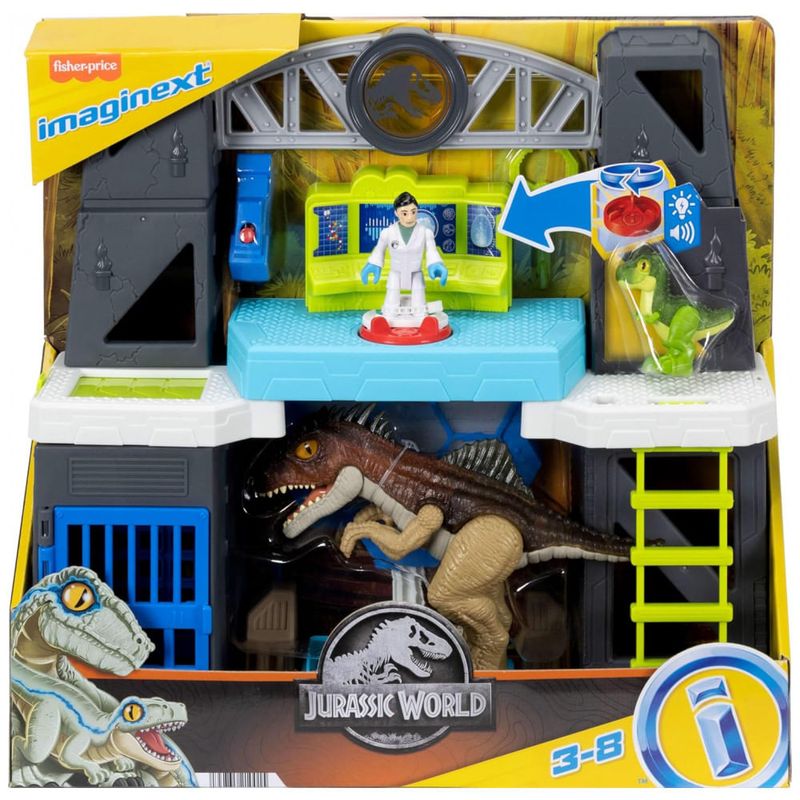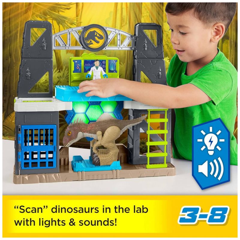 Playset Fisher-Price Imaginext Jurassic World Scan & Glow Dino inspirado nos laboratórios da franquia, com estrutura de dois níveis, luzes e efeitos sonoros para simular análise de dinossauros. No centro do cenário há uma base de escaneamento onde as figuras de dinossauros são posicionadas, elevadas e “escaneadas” ao girar o Power Pad, ativando iluminação e sons temáticos.?