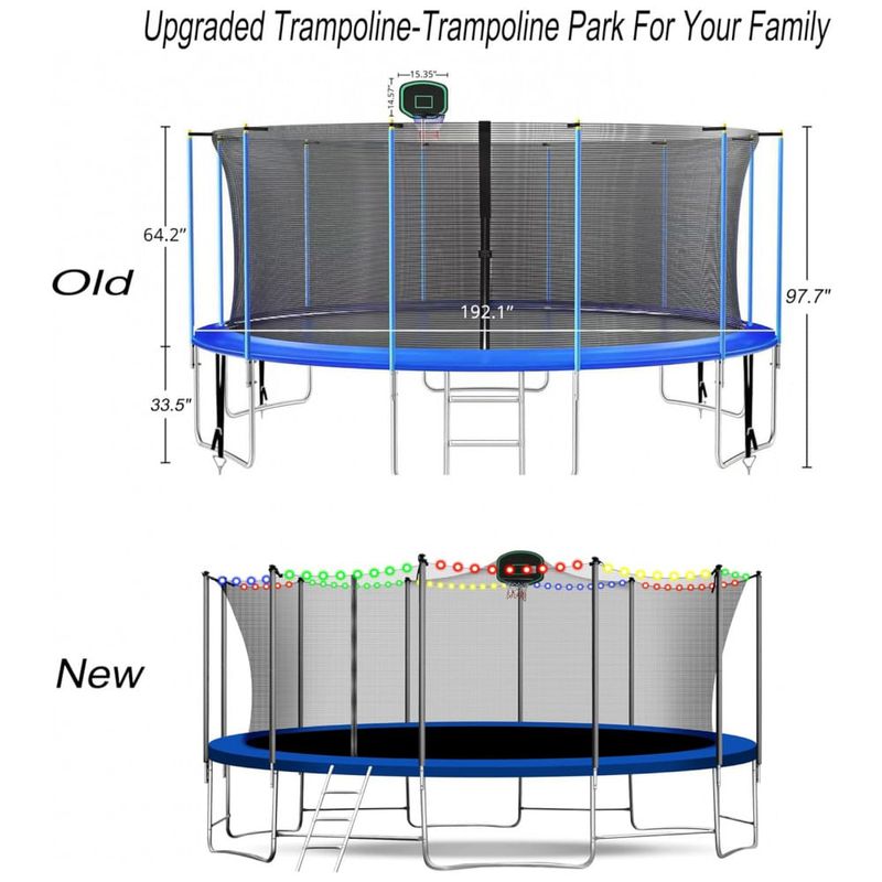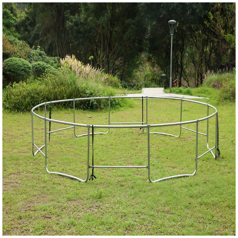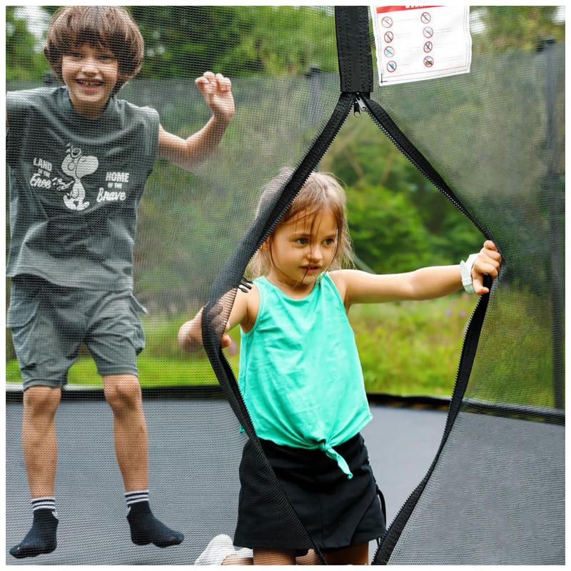 Este trampolim de com compartimentos possui uma rede de segurança de 360 graus que está firmemente presa ao tapete de salto em toda a volta, reduzindo o risco de um braço ou perna cair. Um gabinete completo com uma porta com zíper certamente lhe dá paz de espírito.
