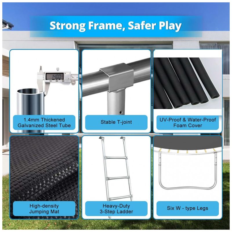 A filosofia de design da FIZITI é Os trampolins devem ser mais s. Os trampolins FIZITI estão em conformidade com a especificação de segurança padrão ASTM F381 16 para componentes, montagem, uso e rotulagem de trampolins para consumidores. Você pode ter certeza de que nossos materiais de segurança estão entre os melhores do para sua família.