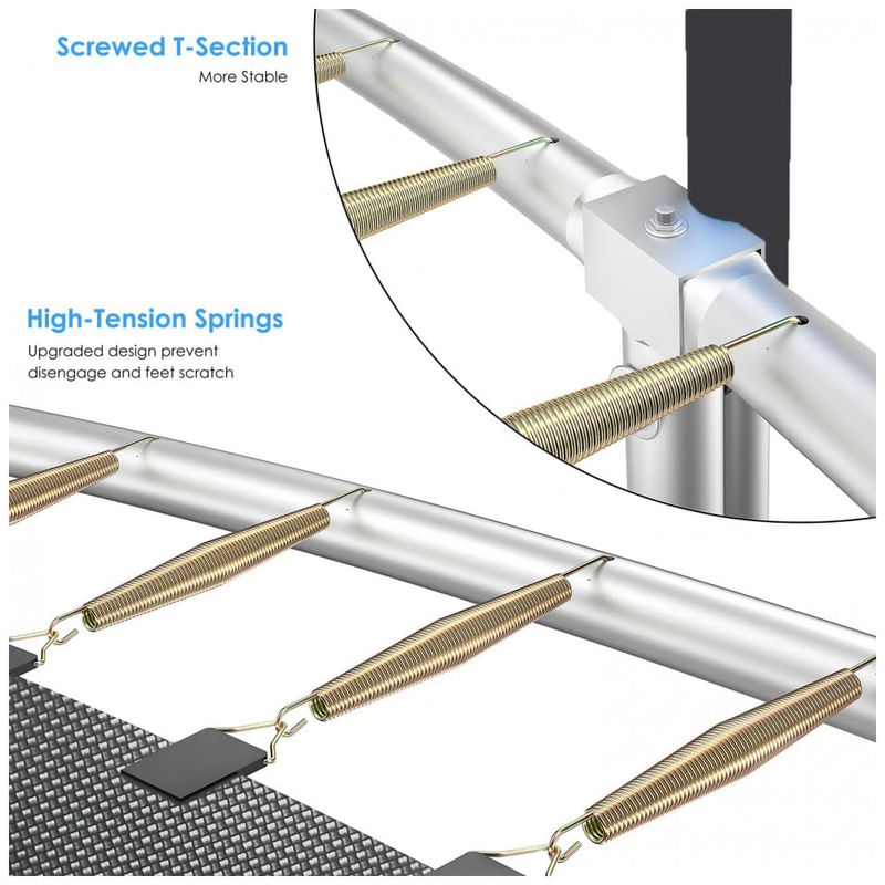 Tapete de trampolim de alta resistência tecido em conjunto que é capaz de lidar com flexão constante, tornando o durável e macio em seus pés. 108 molas galvanizadas uniformemente esticadas ao redor do tapete garantem um salto suave e responsivo.