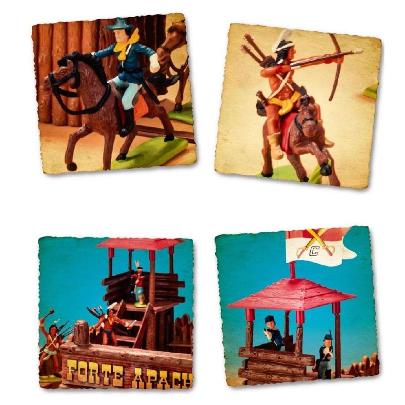 1 forte para montar com 2 torres, 2 mastros com bandeiras, 8 figuras de soldados confederados, 8 figuras de índios e 4 cavalos.