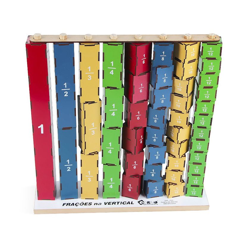 Proporciona uma aprendizagem simples e lúdica das frações, facilitando a visualização e compreensão – A partir de 5 anos. Confeccionado em M.D.F. 46 peças - 1 suporte/base de M.D.F. Possui 08 torres nas cores vermelho, verde, azul e amarelo, pintadas e serigrafadas com tinta ultravioleta atóxica representando as frações: 1 inteiro, 1/2, 1/3, 1/4, 1/6, 1/8, 1/10 e 1/12 avos, acompanha 1 trava de proteção para as torres. Medindo da base/frações: 43 x 41 x 10 cm. Embalagem: Película de P.V.C. encolhível.