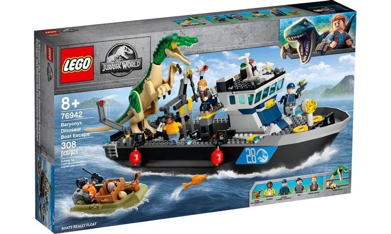 • As crianças podem encenar uma entusiasmante Fuga de Barco do Dinossauro Baryonyx com este fantástico conjunto de brinquedo LEGO® Jurassic World (76942), que contém um barco espetacular que flutua para construir – tem mesmo um dinossauro a bordo!