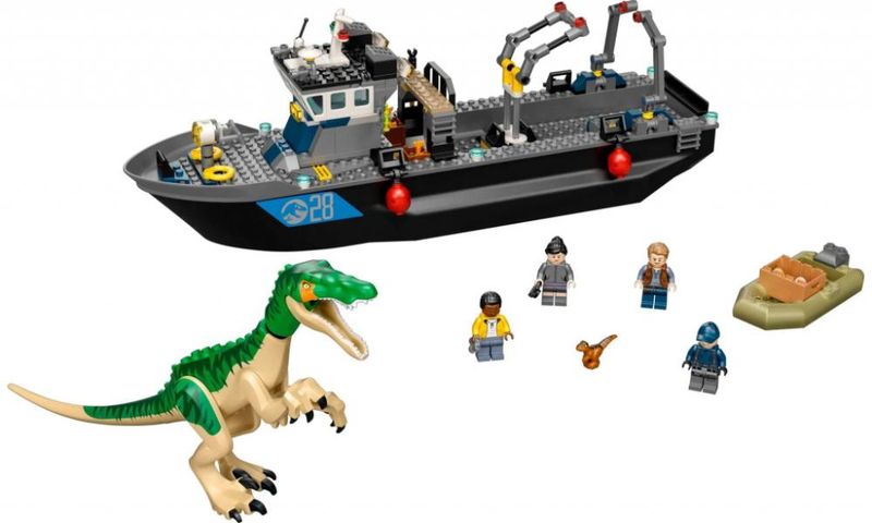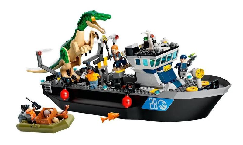 As crianças podem levar a ação de LEGO® Jurassic World para a água com este conjunto de brinquedo Fuga de Barco do Dinossauro Baryonyx. O primeiro conjunto LEGO Jurassic World a incluir barcos, contém um barco construído com peças que flutua, mesmo quando transporta a figura de dinossauro ajustável de Baryonyx. O barco tem uma jaula de dinossauro, holofote giratório e uma sala de comando que se destaca para fácil acesso ao porão de carga.