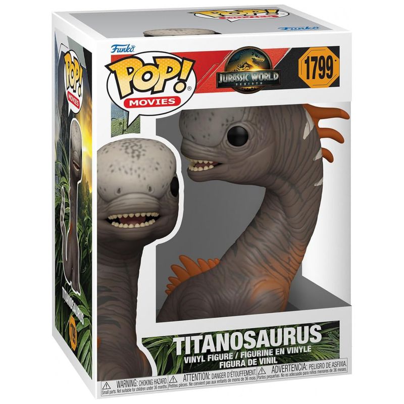 Figura colecionável Funko Pop! Movies inspirada em Jurassic World: Rebirth, representando o dinossauro Titanosaurus em estilo estilizado característico da marca. Produzida em vinil multicolorido com acabamento fosco, a peça se destaca em prateleiras, vitrines ou mesas de trabalho como parte de coleções temáticas de filmes.?