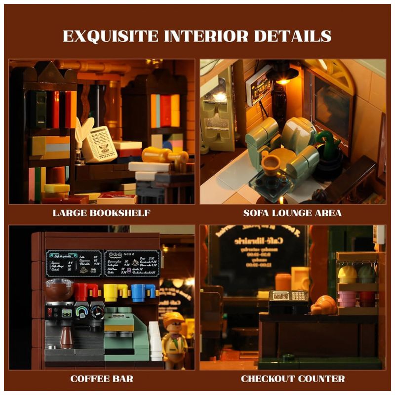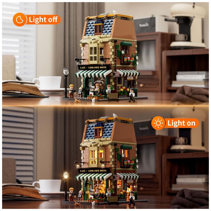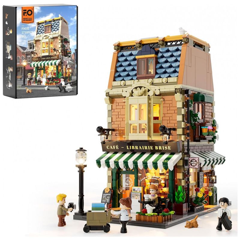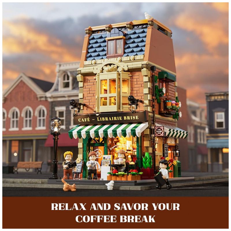 Conjunto de blocos de montar em plástico que representa um café livraria em estilo europeu dos anos 1990, com fachada em dois andares em tons quentes e volumetria típica de rua de cidade. A edificação traz vitrine frontal, marquise, porta principal e janelas amplas no pavimento superior, compondo um cenário urbano aconchegante.