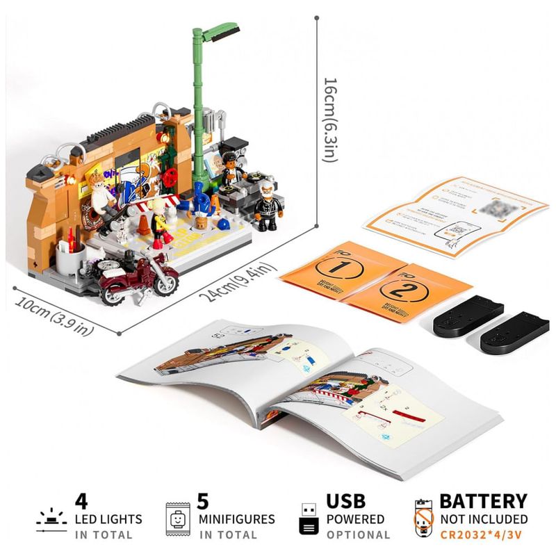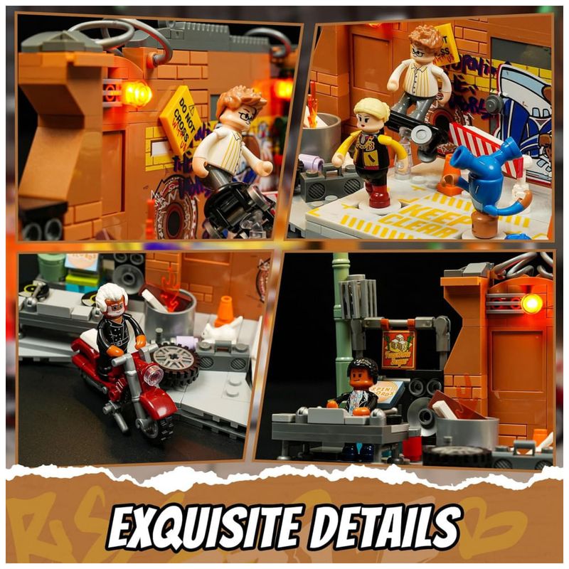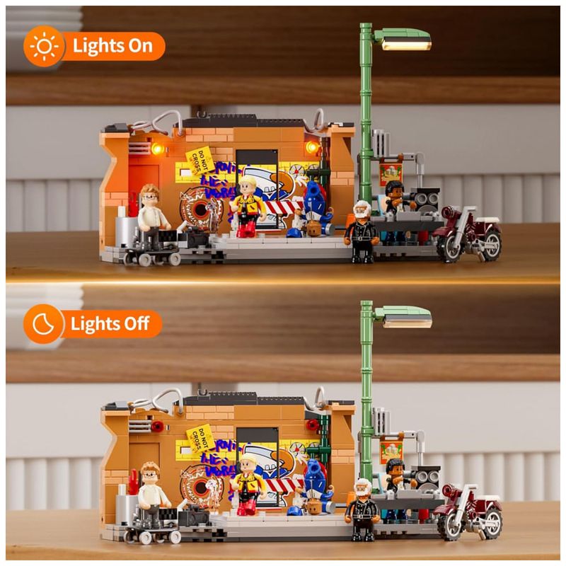 O sistema de iluminação inclui quatro pontos de LED distribuídos em elementos como tambor com fogo, postes de luz e sinalizador de alerta, criando atmosfera de apresentação noturna. O produto é indicado para adolescentes e adultos, com montagem voltada para exposição em coleções de cidade e cultura de rua.
