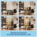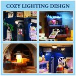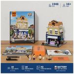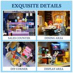O sistema de iluminação é composto por quatro conjuntos de fios com dez pontos de LED distribuídos entre fachada, vitrines e interiores. A combinação de luz branca na frente da loja, luz amarela nas áreas internas e pontos em azul suave na região das janelas superiores cria ambiente visual acolhedor e adequado para exposição em prateleiras ou dioramas urbanos.