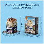 Conjunto de blocos de montar em plástico que representa uma gelateria em estilo europeu, com fachada em múltiplos andares, toldos em azul claro, vitrines amplas e esculturas de sorvete na área externa. A construção reproduz uma rua de cidade com mesas ao ar livre, letreiros retrô e detalhamento de janelas, criando atmosfera de férias e passeio urbano.