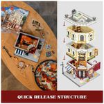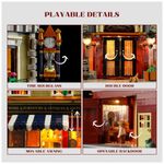A construção utiliza base padrão de 32 x 32 studs, compatível com outros prédios modulares de cidade, possibilitando inserção em ruas e quarteirões montados. Detalhes de interação incluem ampulheta funcional, toldo móvel, portas frontal e traseira, mobiliário variado e quatro minifiguras, além de um gato compondo o cenário.??