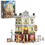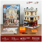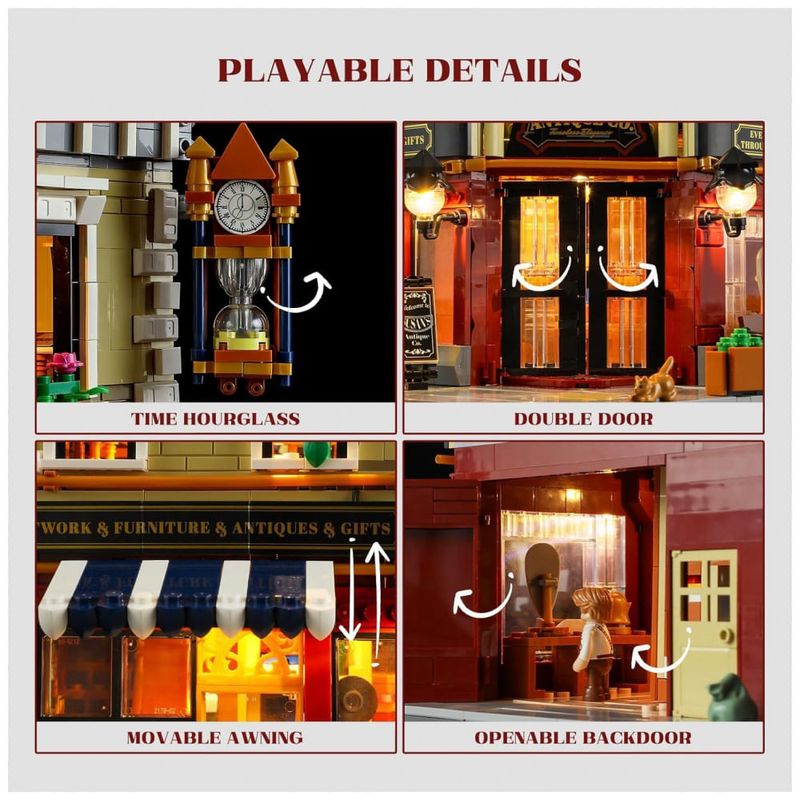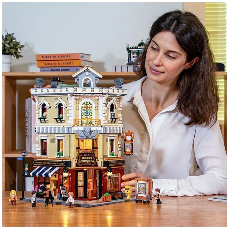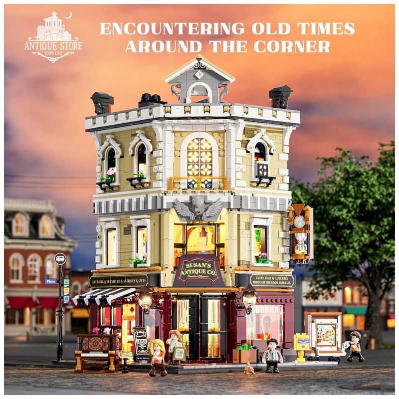 Conjunto de blocos de montar em plástico que representa uma loja de antiguidades em esquina de cidade europeia, com fachada de três andares, vitrine em ângulo e janelas com vitrais no último piso, destacando o edifício na paisagem urbana. A arquitetura segue estilo europeu clássico, com cornijas, colunas decorativas, letreiros e detalhes em relevo que reforçam a identidade de loja especializada em peças antigas.??